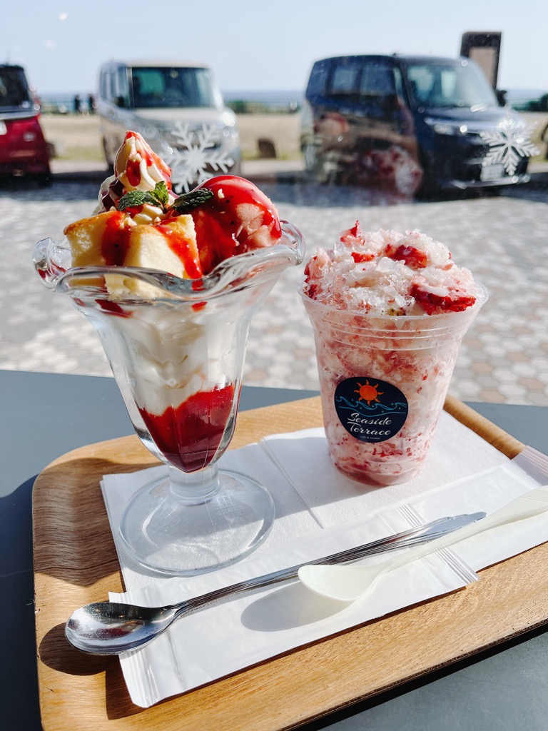 海で散歩しながら写真撮って、パフェとかかき氷食べて、帰りに2か所買い物寄って、最後に近所の灯台でまた写真撮って…笑。